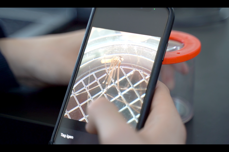 Tilbage på skolen skal I lave optagelser af naturguiderne, der undersøger jeres fund med et forstørrelsesglas og artsbestemmer det