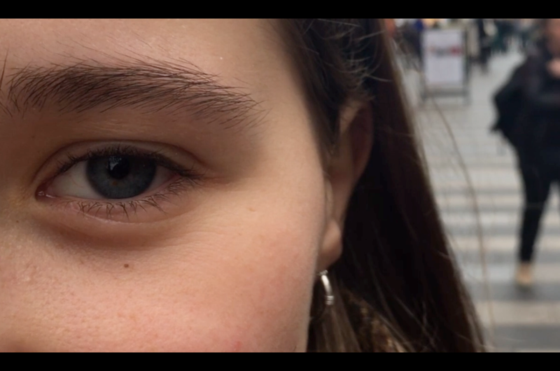 Vi er helt tæt på en detalje eller dele af et ansigt, der fylder næsten hele billedet.