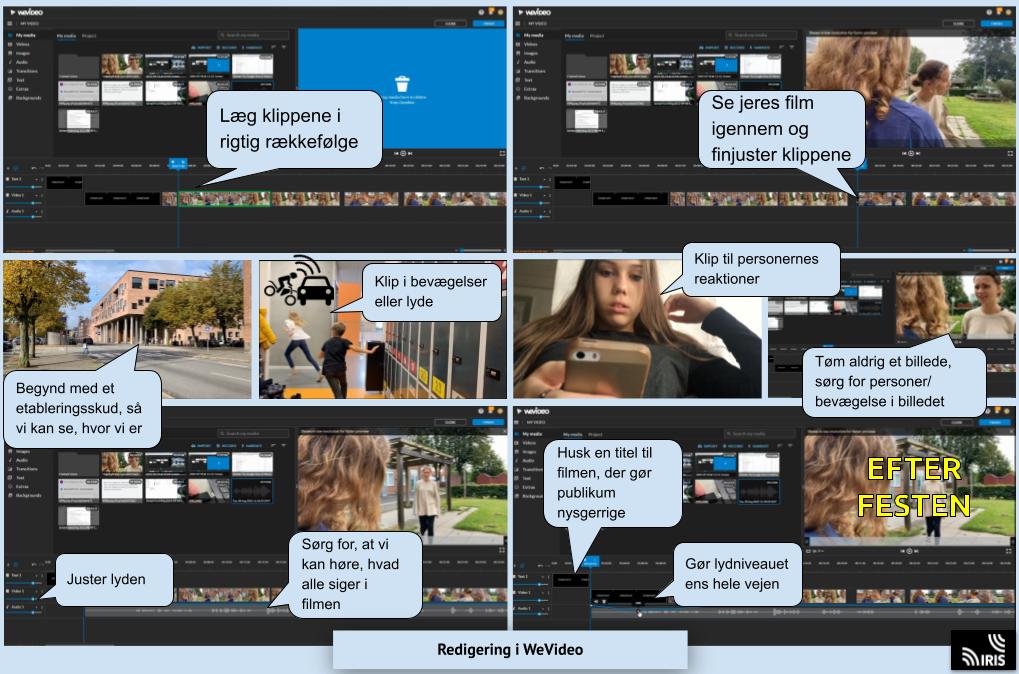 - Læg jeres optagelser ind i et redigeringsprogram og klip jeres film sammen i denne rækkefølge: